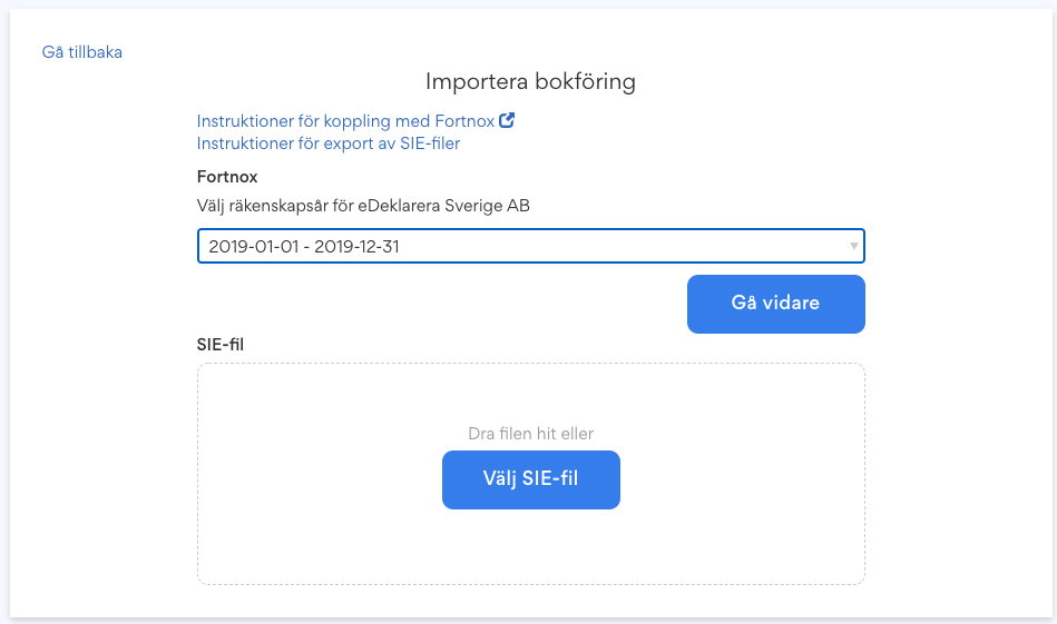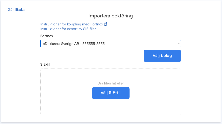 Du kan även överföra din bokföring från Fortnox genom att överföra din SIE-fil. Se instruktioner för hur man påbörjar en ny årsredovisning från SIE-fil samt instruktioner för hur man exporterar SIE-filer från Fortnox.